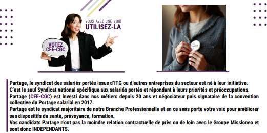 Partage, le syndicat des salariés portés issus d’ITG ou d’autres entreprises du secteur est né à leur initiative. C’est le seul Syndicat national spécifique aux salariés portés et répondant à leurs priorités et préoccupations. Partage (CFE-CGC) est investi dans nos métiers depuis 20 ans et négociateur puis signataire de la convention collective du Portage salarial en 2017