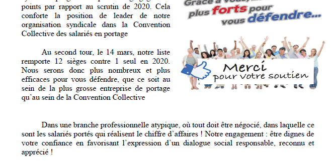 PARTAGE CFE-CGC est le seul syndicat a progressé en pourcentage gagnant 9 points par rapport au scrutin de 2020. Cela conforte la position de leader de notre organisation syndicale dans la Convention Collective des salariés en portage