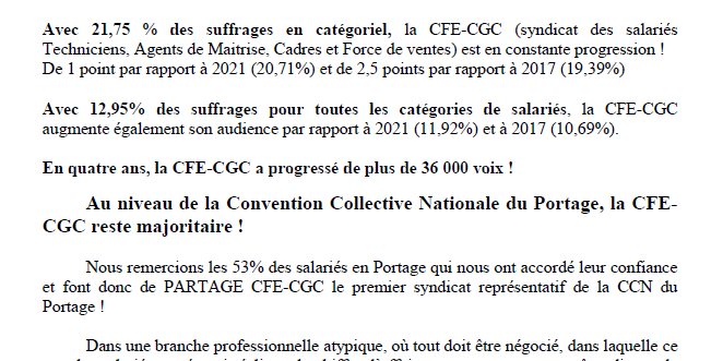 Nous remercions les 53% des salariés en Portage qui nous ont accordé leur confiance et font donc de PARTAGE CFE-CGC le premier syndicat représentatif de la CCN du Portage !